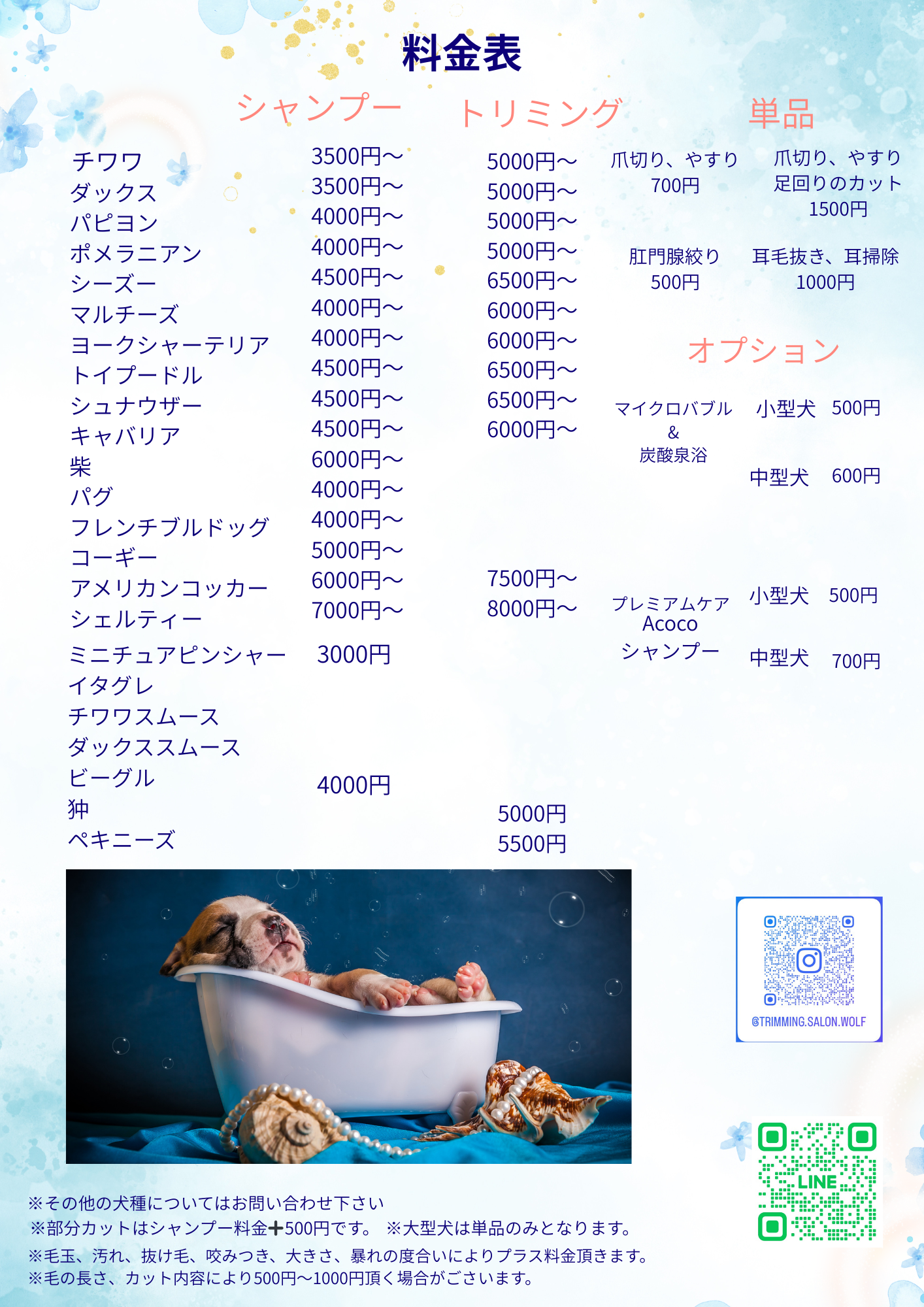 ラベンダーとアロエが主成分の整菌するシャンプー!殺菌する強い成分ではなく肌環境を整えて健やかな肌に導きます。またアロエのコーティングで毛玉を痛みなくほどくことで犬の負担をなくします!形状記憶効果もあるので軟毛などのスタイル維持にも! 一つのシャンプーで美容と健康をサポートします!またReFaのシャワーヘッドでマイクロバブルを標準使用!炭酸泉温浴や高保湿、お肌の強化にミルク風呂、肉球ケアのオプションもご用意しております。標準のシャンプーも厳選した物を使用。オプションの高級シャンプーをどんな子にも使ってもらいたいから低価格でご提供しています!小さなコンテナのお店だから出来る最高のケアを低価格でご体感いただけます!