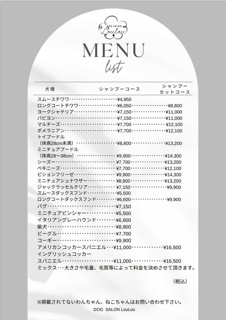 スムースチワワ 4,950円 ロングコートチワワ 6,050円 ヨークシャテリア 7,150円 パピヨン 7,150円 マルチーズ 7,700円 ポメラニアン 7,700円 トイプードル(体高28cm未満) 8,800円 ミニチュアプードル(体高28〜38cm) 9,900円 シーズー 7,700円 ペキニーズ 7,700円 ビションフリーゼ 9,900円 ミニチュアシュナウザー 8,800円 ジャックラッセルテリア 7,150円 スムースダックスフンド 5,500円 ロングコートダックスフンド 6,600円 パグ 7,150円 ミニチュアピンシャー 5,500円 イタリアングレーハウンド 6,600円 柴犬 8,800円 ビーグル 7,700円 コーギー 9,900円 アメリカンコッカースパニエル 11,000円 イングリッシュコッカースパニエル 11,000円 ミックス・・・大きさや毛量、毛質等によって料金を決めさせて頂きます。 ※掲載されてないわんちゃん、ねこちゃんはお問い合わせ下さい。